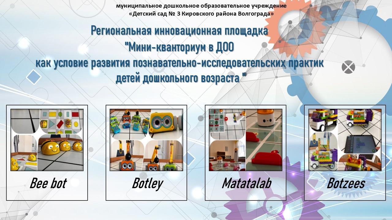 С сентября 2025 года МОУ Детский сад № 3 присвоен статус РЕГИОНАЛЬНОЙ ИННОВАЦИОННОЙ ПЛОЩАДКИ по теме "«Мини-кванториум в ДОО как условие развития познавательно-исследовательских практик детей дошкольного возраста». Цель инновационного проекта - создание современного инновационного пространства для сопровождения познавательных практик детей дошкольного возраста посредством организации мини-кванториума - специализированного пространства, оснащенного современными технологиями и оборудованием, стимулирующего исследовательские практики, творческое мышление и интерес к науке и технике у детей дошкольного возраста. Срок реализации - 2025-2030гг.